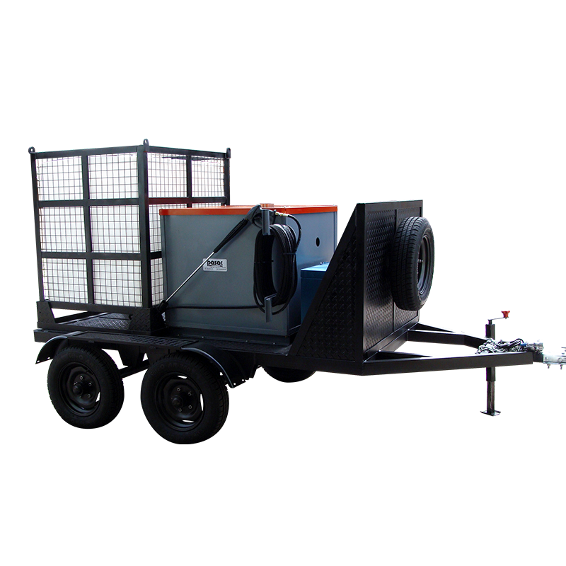 No requiere suministro eléctrico externo. La hidrolavadora PASAC Línea petrolera viene montada sobre un trailer de dos ejes con luces reglamentarias, ruedas de auxilio, caja de herramientas, depósito de agua para 1000 litros incorporado, protegido por jaula me†alicantino.
